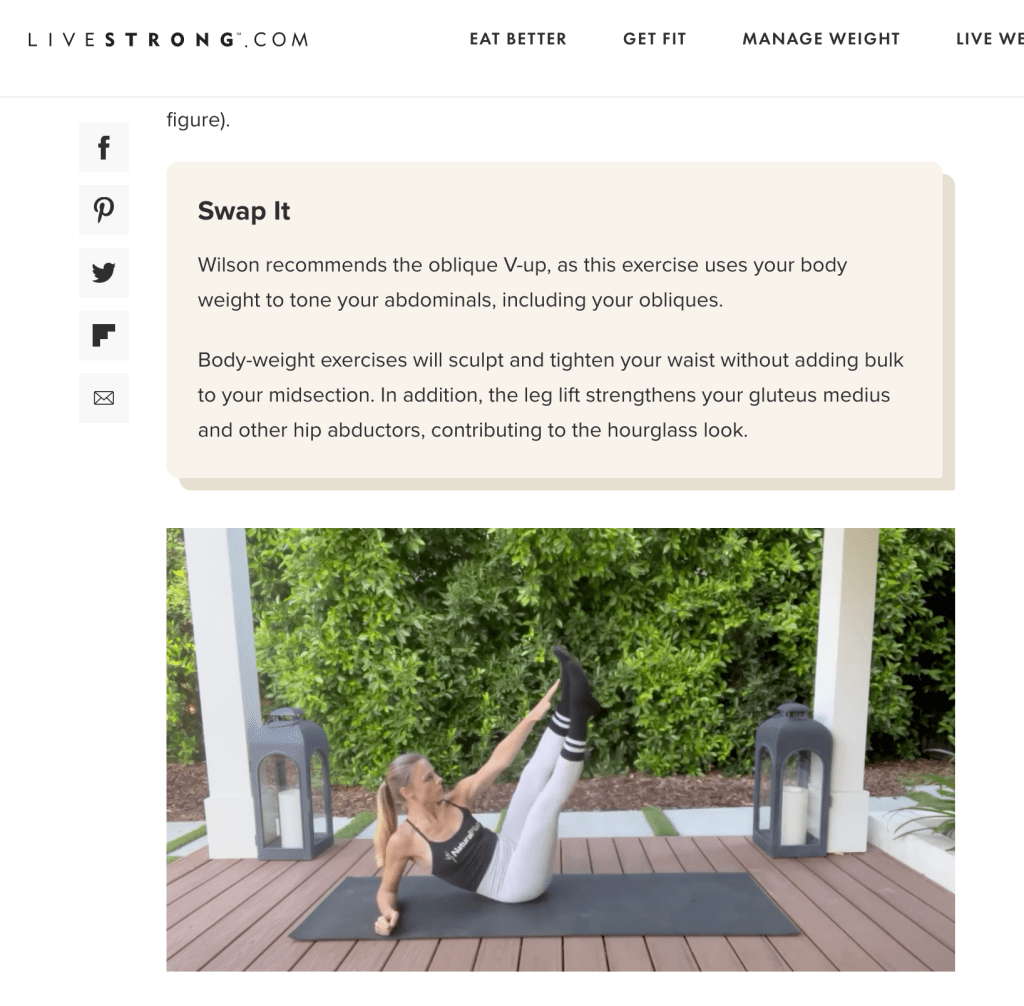 Livestrong featured Laura Wilson in an article about toning your midsection. In this article, Laura provides some of her favorite Pilates exercises to strengthen the abdominals, obliques, and back. Video demos and step-by-step instructions are included in this article.